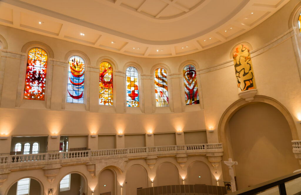 C’est à l’artiste ARCABAS que la conception des 24 vitraux est confiée. Œuvre originale sur le thème de la Création.