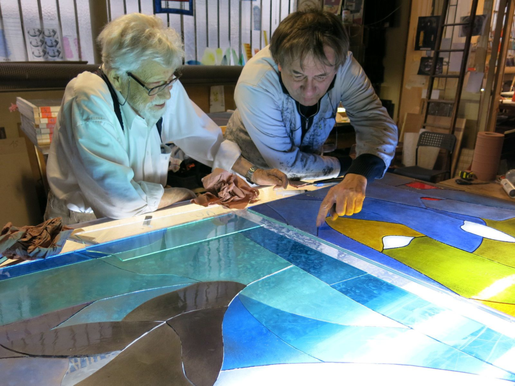 Pour la réalisation des vitraux, Arcabas (à gauche) a souhaité une collaboration avec Christophe Berthier (à droite), maitre-verrier, dont l’atelier Berthier-Bessac se trouve à proximité immédiate de la basilique du Sacré-Cœur.