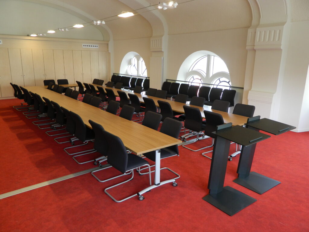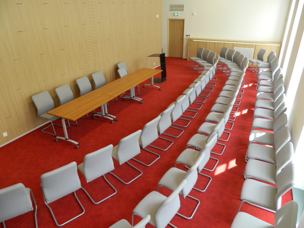 Equipement: Un mobilier de qualité, un réseau WIFI, une sonorisation équipée de 2 micros HF, un vidéoprojecteur connectique (VGA/HDMI), 2 pupitres de conférence.